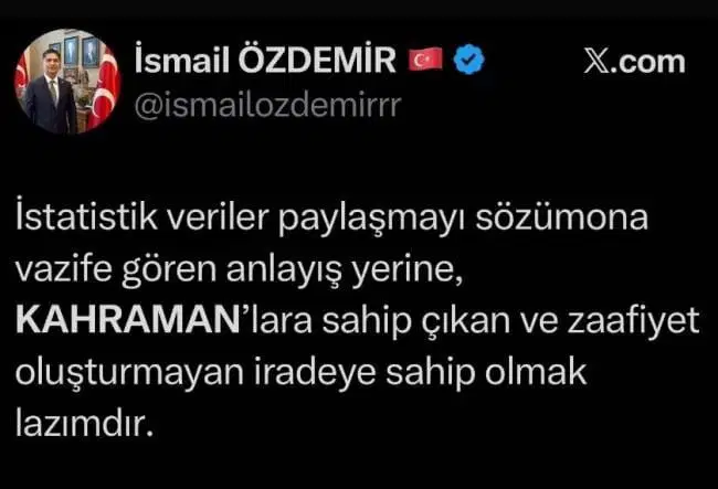 X’teki kişisel hesabındaki paylaşımında Özdemir, “İstatistik veriler paylaşmayı sözüm ona vazife gören anlayış yerine, kahramanlara sahip çıkan ve zafiyet oluşturmayan iradeye sahip olmak lazımdı” ifadelerini kullanmıştı.