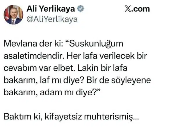 Ali Yerlikaya paylaşımında, “Bir lafa bakarım, laf mı diye? Bir de söyleyene bakarım, adam mı diye? Baktım ki, kifayetsiz muhterismiş…” dedi.