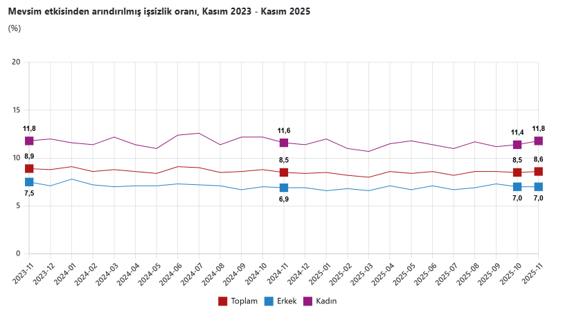 Türkiye İstatistik Kurumu (TÜİK), Kasım 2025 işgücü istatistiklerini açıkladı. TÜİK verilerine göre, işsizlik kasımda yüzde 8,6 seviyesine yükseldi. Hanehalkı İşgücü Araştırması sonuçlarına göre, 15 yaş ve üzeri kişilerde işsiz sayısı bir önceki aya göre 54 bin kişi artarak 3 milyon 98 bin kişi olarak gerçekleşti. İşsizlik oranı ise 0,1 puanlık artışla yüzde 8,6 olarak belirlendi. Erkeklerde işsizlik oranı yüzde 7,0 iken kadınlarda yüzde 11,8 olarak tahmin edildi.