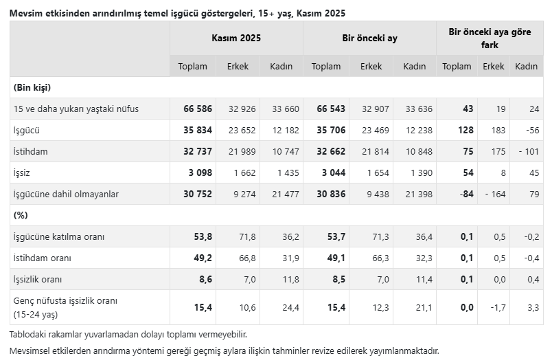 İşgücü, 2025 yılı Kasım ayında bir önceki aya göre 128 bin kişi artarak 35 milyon 834 bin kişiye yükseldi. İşgücüne katılma oranı ise 0,1 puanlık artışla yüzde 53,8 seviyesine çıktı. İşgücüne katılma oranı erkeklerde yüzde 71,8 iken kadınlarda yüzde 36,2 olarak gerçekleşti.