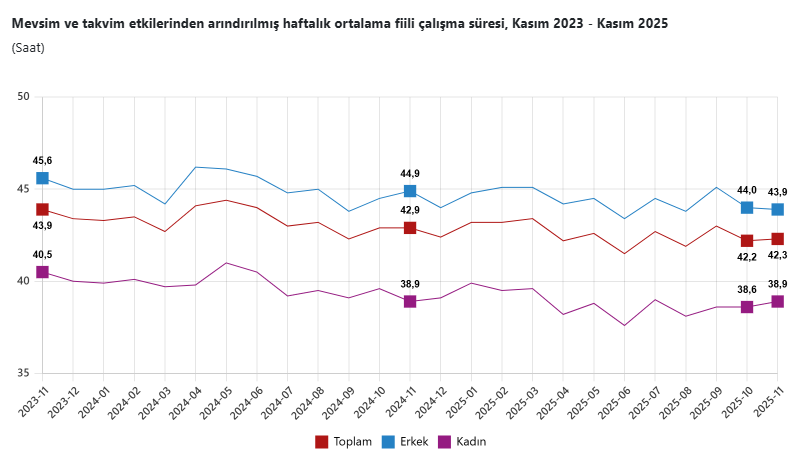 Referans döneminde işbaşında olan istihdam edilenlerin mevsim etkilerinden arındırılmış haftalık ortalama fiili çalışma süresi, 2025 yılı Kasım ayında bir önceki aya göre 0,1 saat artarak 42,3 saat olarak gerçekleşti.