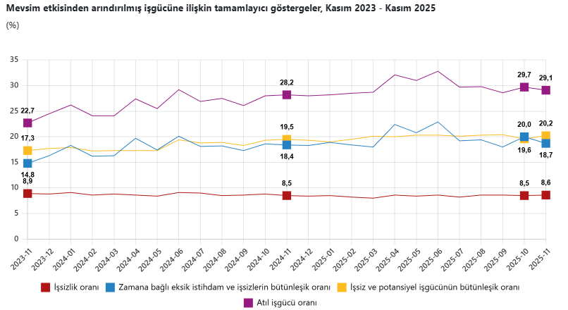 Zamana bağlı eksik istihdam, potansiyel işgücü ve işsizlerden oluşan atıl işgücü oranı, 2025 yılı Kasım ayında bir önceki aya göre 0,6 puan azalarak yüzde 29,1 seviyesine geriledi. Zamana bağlı eksik istihdam ve işsizlerin bütünleşik oranı yüzde 18,7 iken işsiz ve potansiyel işgücünün bütünleşik oranı yüzde 20,2 olarak tahmin edildi.