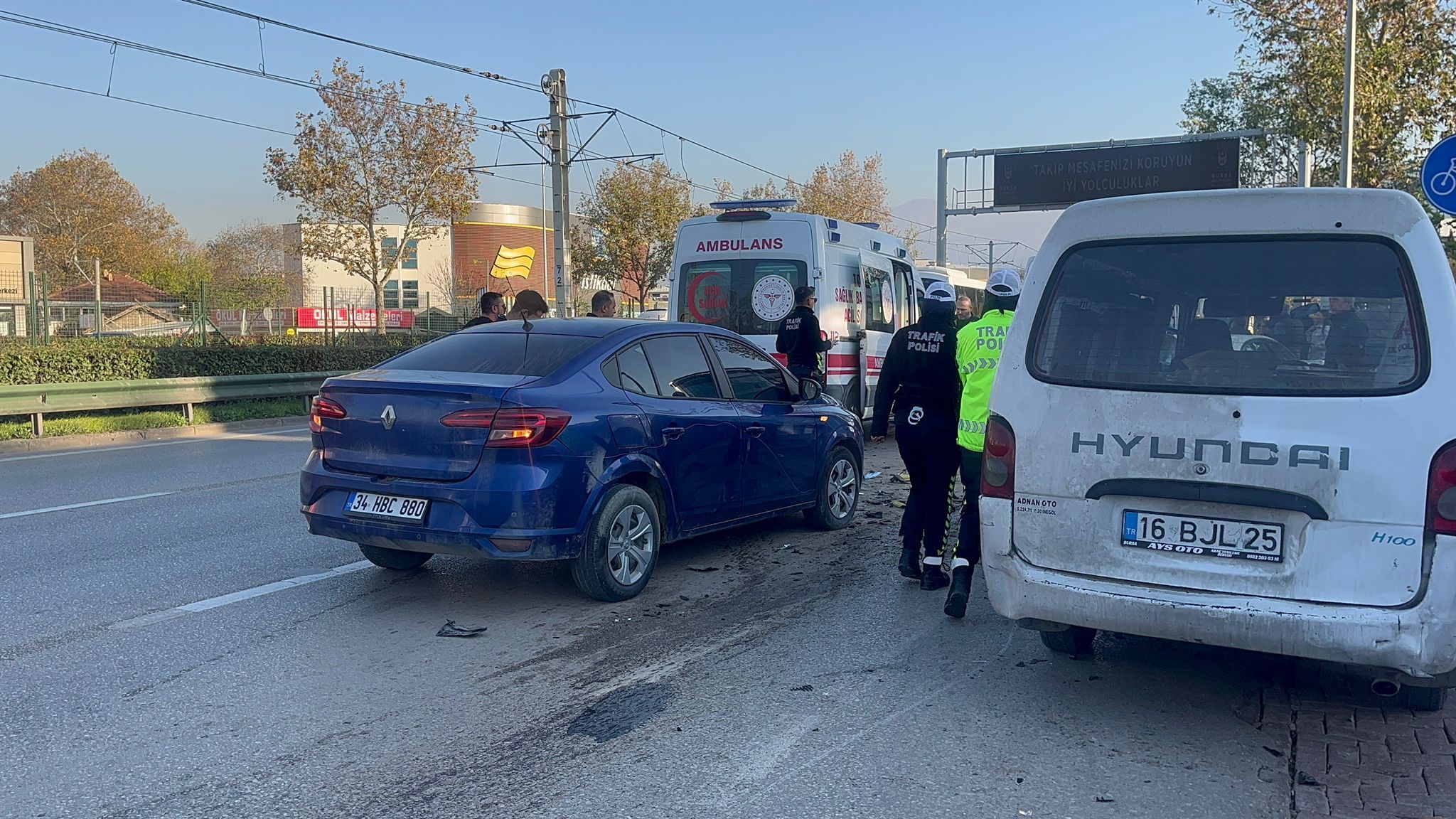Bursa’nın Osmangazi ilçesi Yenikaraman Mahallesi’nde, saat 15.30 sıralarında meydana gelen olayda, iddiaya göre sürücülerinin kent merkezi yönüne yarışarak ilerlediği 34 HBC 880 ve 16 BUS 776 plakalı otomobiller, ara sokaktan caddeye çıkan belediye otobüsüyle çarpıştı.